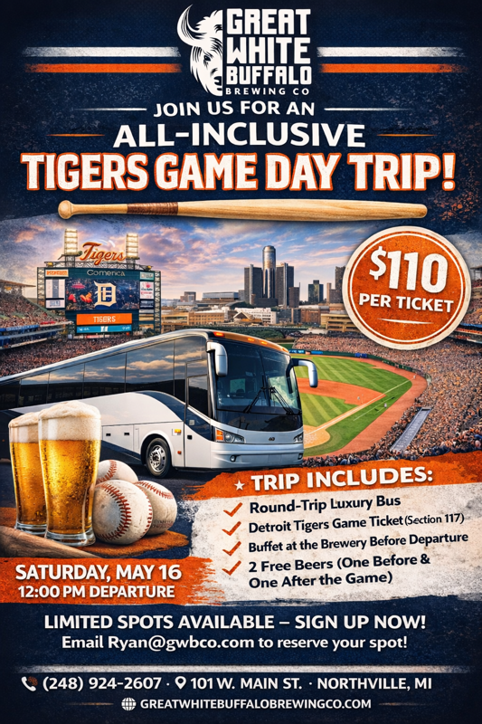 Hop on board for the ultimate all-inclusive trip with Great White Buffalo Brewing Company as we head to cheer on the Detroit Tigers!